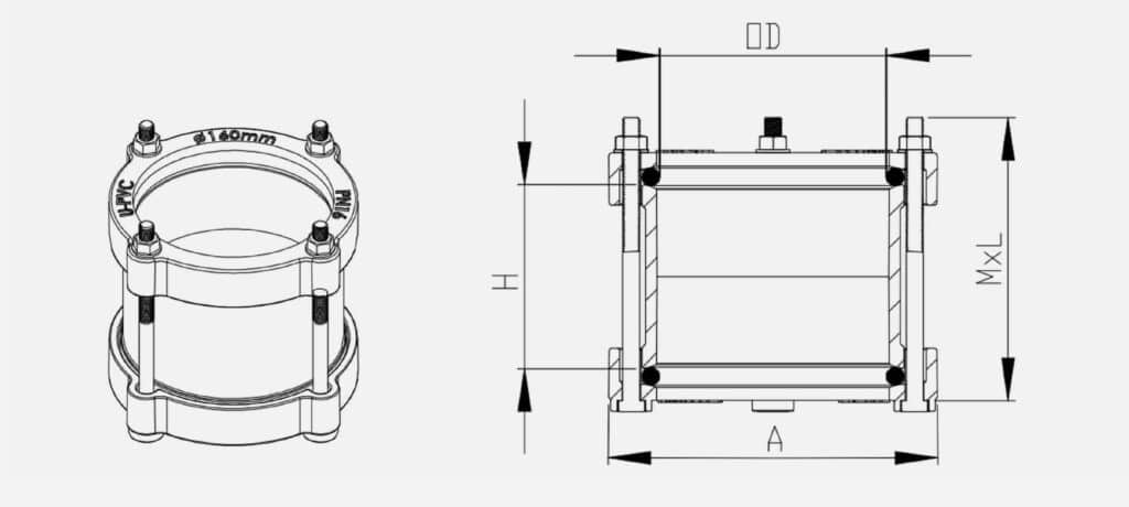 | PVC Pipe Outside Diameter | A | H | MXL | Bolts Number |
